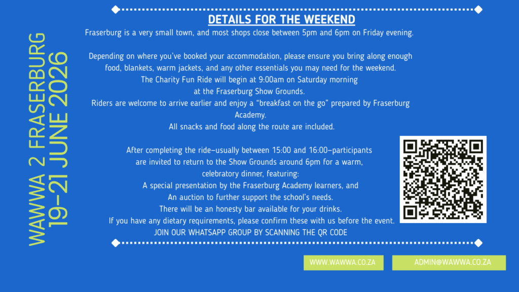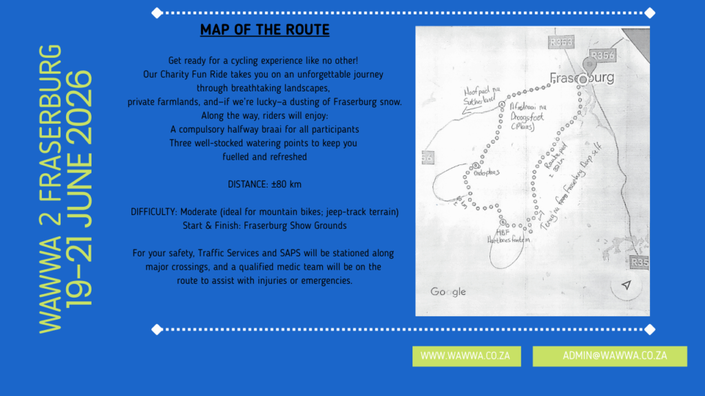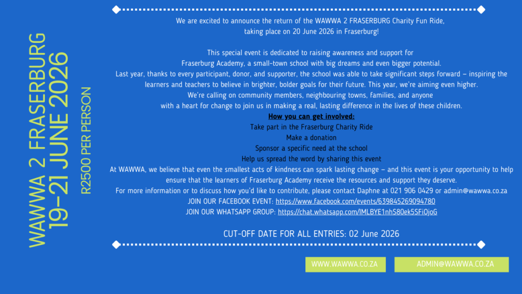 Should you wish to book accommodation in Fraserburg for this weekend, kindly contact Michelle on 0731687713.